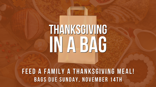 One of our favorite times of year is Thanksgiving and we love getting out and showing God's love in our actions by handing out Thanksgiving Bags to those in need in our community. We'd love your help with this! Help us get these bags together by purchasing thanksgiving food items (packing list requirements will be handed out at the HUB) We'll supply the bags, you just bring the food items. If you have any questions, please reach out to Tiffany Penley.