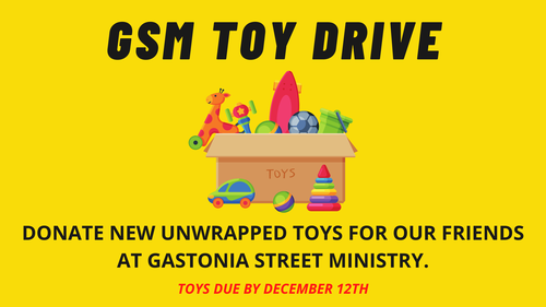 Each year we host a Toy Drive for our friends at Gastonia Street Ministry. How can you help? Grab a card from our TBC tree located in the sanctuary, and shop for that kid as if you were buying Christmas for them! The TBC Tree will go up on 11/30.